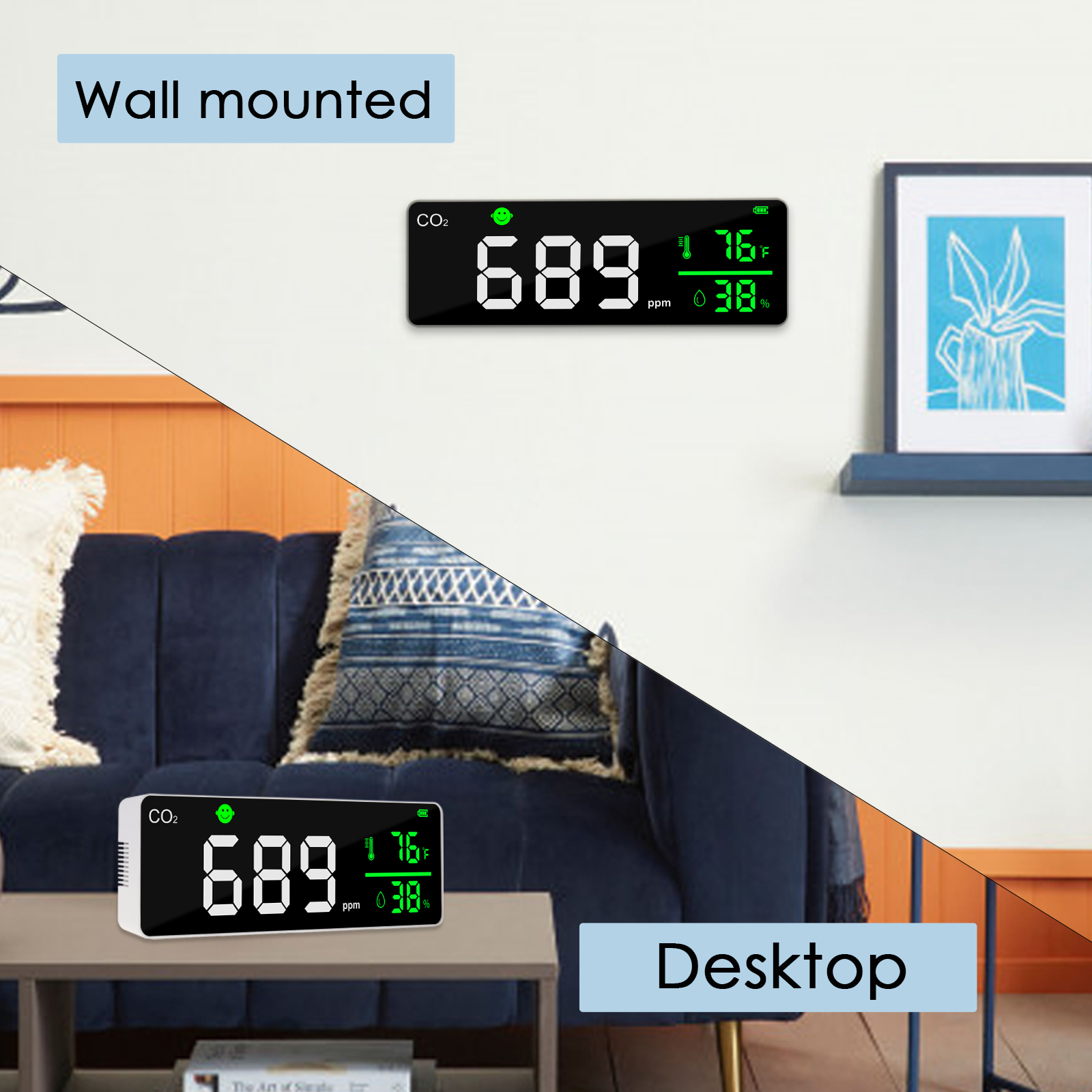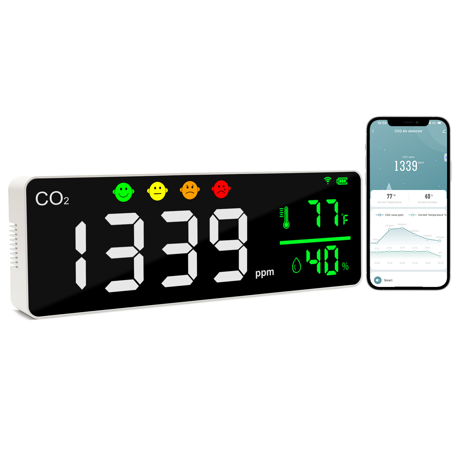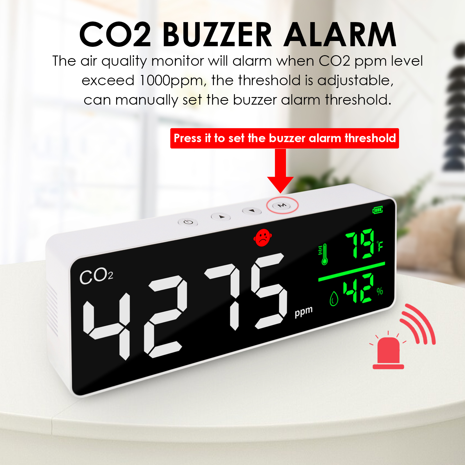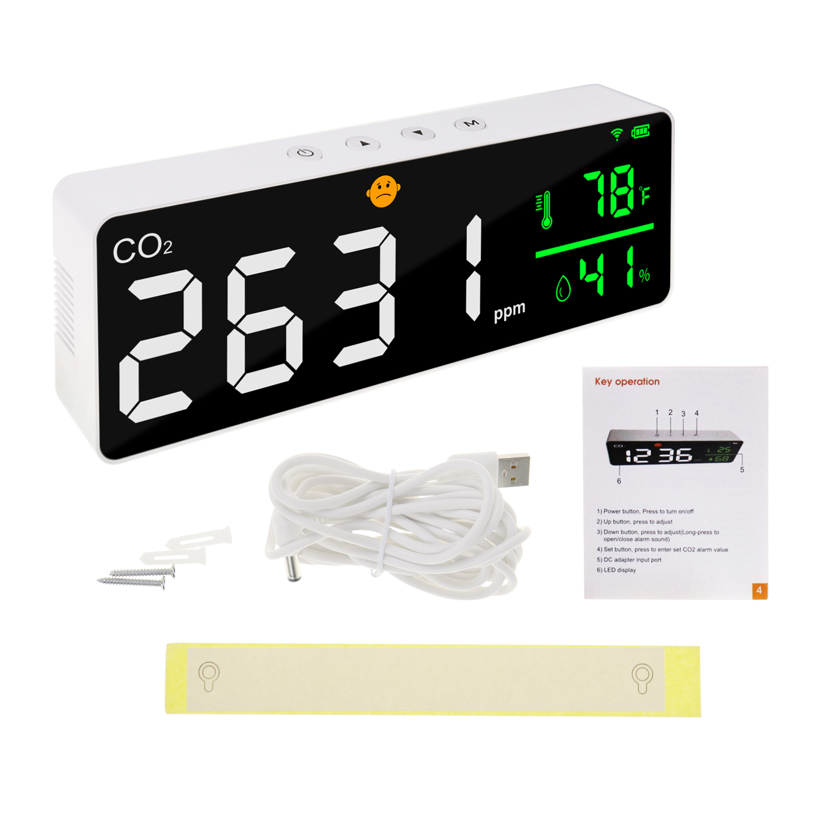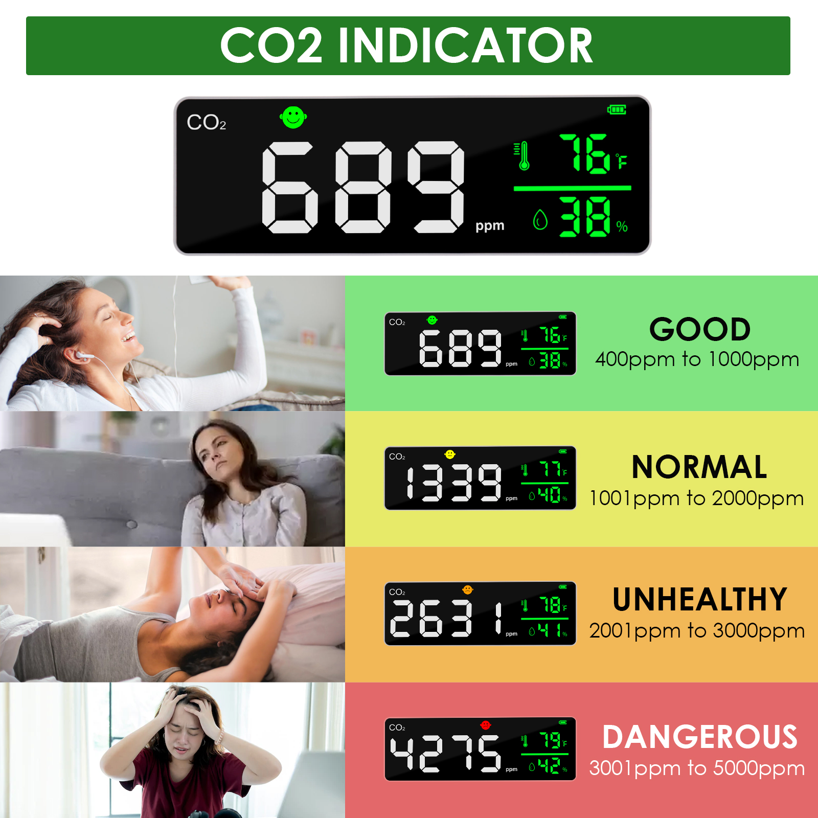✅【Face icons Alarm】The alarm face icon will automatically switch when the CO2 at different level. 【Green Face】400~1000ppm;【Yellow Face】1001~2000ppm;【Orange Face】2001~3000ppm;【Red Face】3001~5000ppm