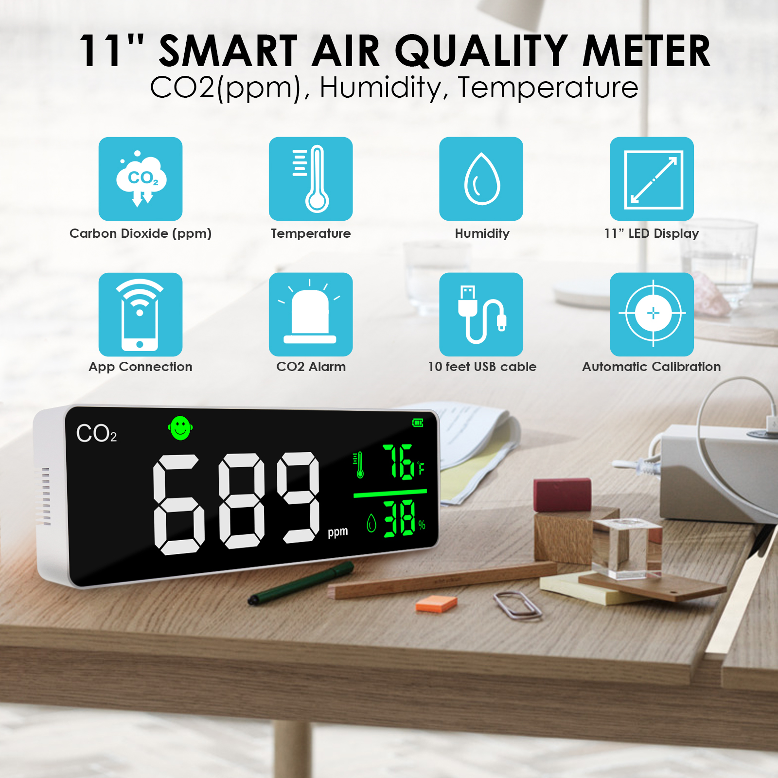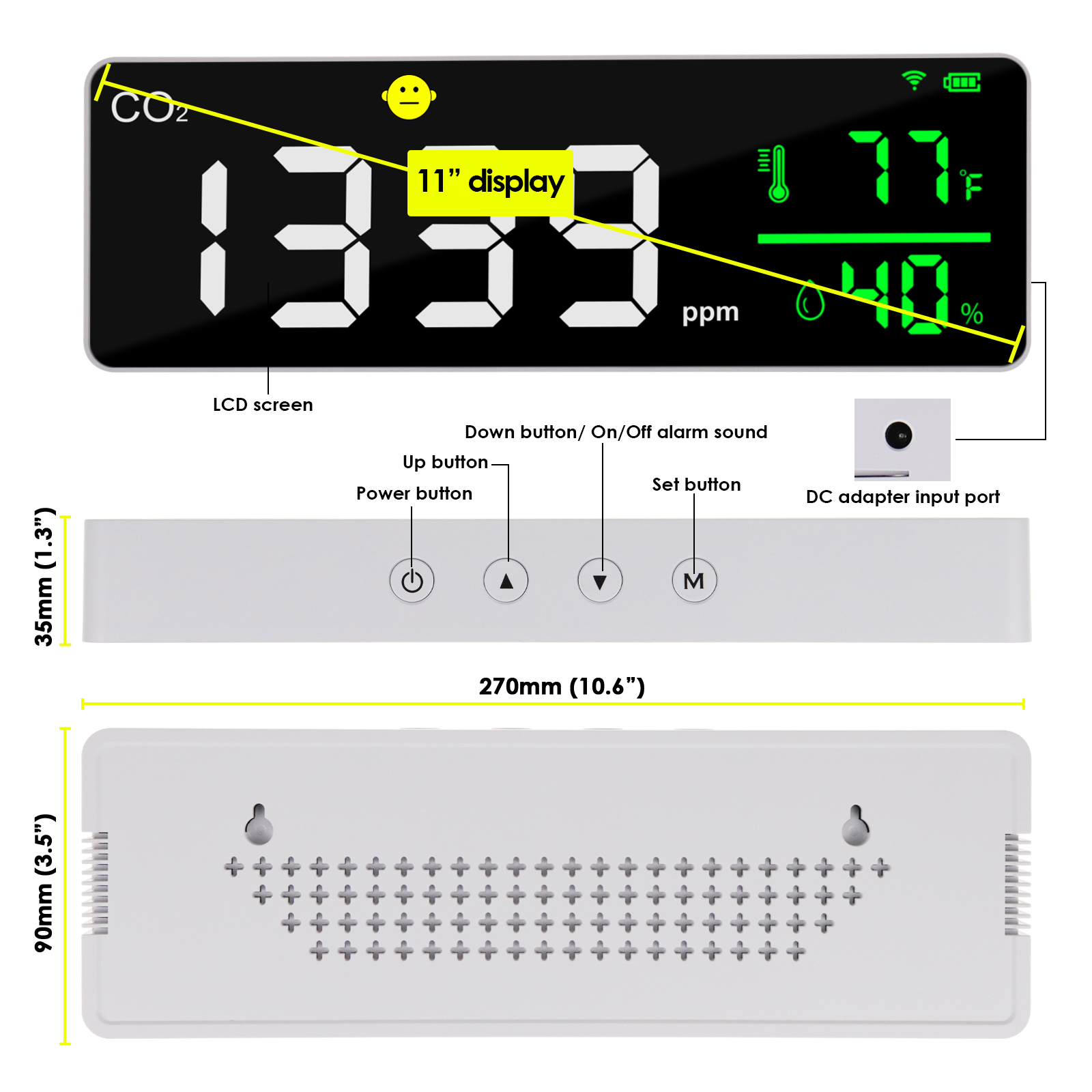 DP-353 CO2 Detector Smart WiFi CO2 Monitor 11” LED Display Air Quality Monitor for Carbon Dioxide, Humidity, Temperature, App Control Air Quality Tester with Alarm for Home, Office, Grow Tents, etc.