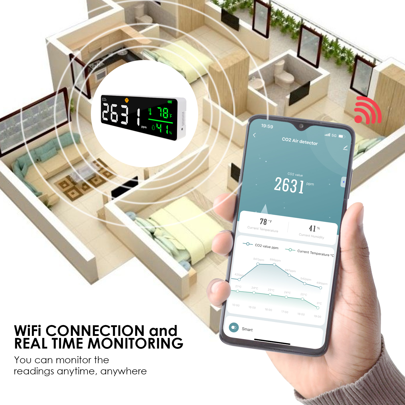 ✅【Smart WiFi Connection】This Air quality detector can connect to your mobile phone via Tuya app in 2.4GHz Wi-Fi directly , which allow to monitor the real time co2 level(ppm), temperature and humidity at anytime anywhere.